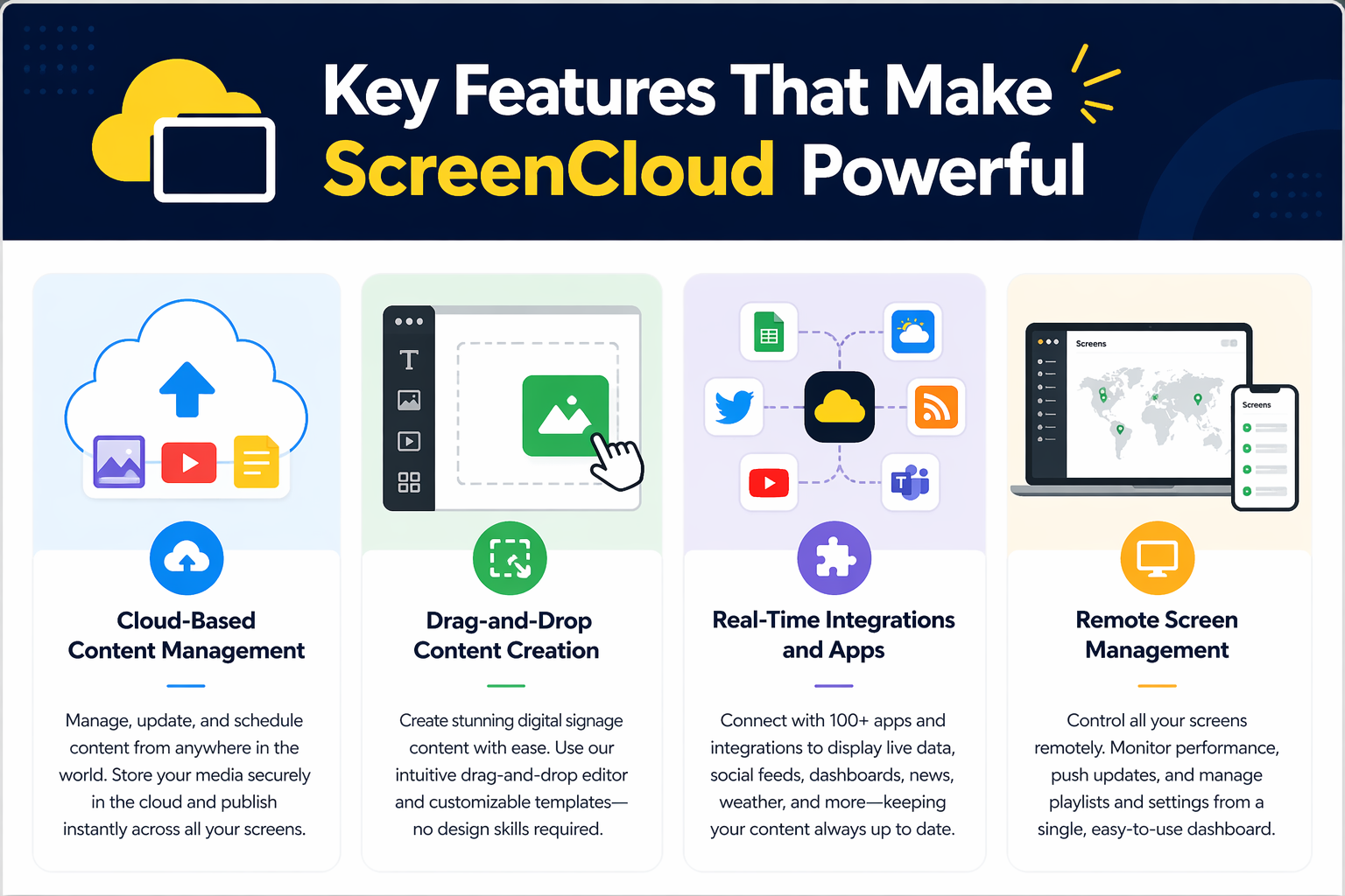 Modern businesses also deal with distributed teams and global customers. They need a way to communicate consistently, whether it’s in retail stores, corporate offices, or remote branches. This is where advanced platforms like ScreenCloud step in, offering centralized control and real-time updates.